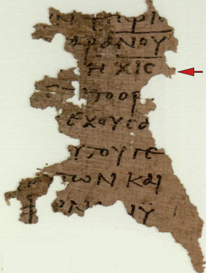 3. The third letter (the numeral “6”) in the “Codex Vaticanus” manuscript image would likely not have been written that way originally. In earlier manuscripts, such as the papyri, the shape is different. Below is a picture of one of the few papyri of a portion of the book of Revelation that has survived. It is P115 and dates to 225-275 A.D. It has the passage that gives the number of the beast — except this is the famous example that has “616” instead of “666” (the red arrow points to the number). That difference doesn’t matter for us, since the last number/letter is “6”: