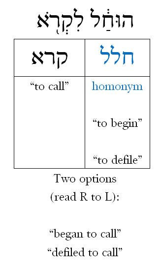 The statement is odd. There is no Scripture citation that in the days of Enosh people began defiling God’s name. I’m guessing that he means Gen 4:26, which most Bibles have as: “At that time people began to call upon the name of the Lord” (ESV). Missler thinks that a mistranslation, but it isn’t. The difference between that translation and having the verse say that “people began to defile the name of the Lord” is due to the first of two verbs in a sequence being a Hebrew homonym. Like English, Hebrew has distinct words that are spelled exactly the same way but are divergent in meaning (e.g., “lead” [the verb] and “lead” [the metal] — and think of how that also muddies the “root” idea discussed above). To illustrate: