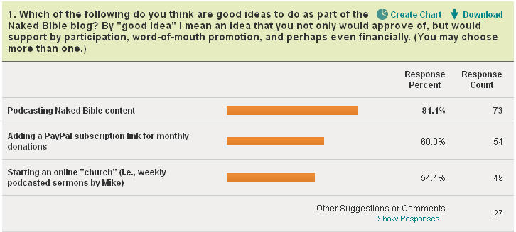 Just wanted to give readers a brief update on the Naked Bible’s two running surveys.