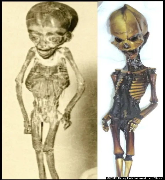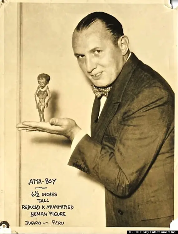 In the latest twist to the Steven Greer ET disclosure shell game (hat tip to BK), Greg Newkirk of the Who Forted? blog and Lee Spiegel of the Huffington Post (photo credit for the image below) have produced evidence that Robert Ripley of Ripley's Believe it Or Not fame had found a 6.5-inch "alien" he called "Atta-boy" (Ripley's specimen was from Peru, not Atacama, Chile, the region from which Greer's "alien" hails, so the phonetic similarity seems coincidental).