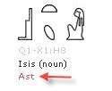 In the world of Maxwell the first syllable in “Israel” (“is” or “yis”) must come from “Isis”. Why? Because they sound the same. Yeah, they sound the same IN ENGLISH! Unfortunately for Maxwell, the Egyptians didn’t write or speak English. “Isis” was not the way the Egyptians pronounced the name of this goddess. That pronunciation comes from Greek and Coptic, languages that came into the biblical world centuries after Hebrew. The Egyptian pronunciation of the name of this goddess was something like “Waset” or “Awset.” No resemblance to “is” or “yis”. Here’s how “Isis” is spelled in hieroglyphs: