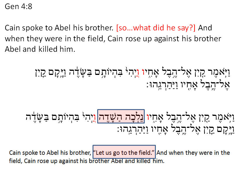If there are any out there who like Syriac, this is pretty cool. I’m actually not one of them. I actually suggested that it be removed from my graduate program in favor of Akkadian and more Ugaritic. The reason is that languages and literature pre-dating or contemporaneous to the biblical Hebrew text are just more valuable. Syriac is something useful for textual criticism, but (frankly) what you need to know there is in commentaries that closely engage the text. By way of example, the image below shows that, in Gen 4:8 the conversation between Cain and Abel has been accidentally omitted in the Masoretic Text (MT). The reason is simple. The scribe’s eye skipped from one waw to another (see the red Hebrew letters), thus omitting the two words that matter. The correct text is witnessed in the Septuagint and the Syriac. The Syriac testimony is of note since Syriac Bibles typically translate the traditional Masoretic text — but in this case, the Syriac base text preserves the correct reading — pointing to (cover your ears, KJV-only / MT-only people) the fact that there is more than one Masoretic manuscript tradition (and one that agrees with the “satanic” Septuagint base – anyone who has seen the Chick tract on Bible versions will get a chuckle out of that comment).