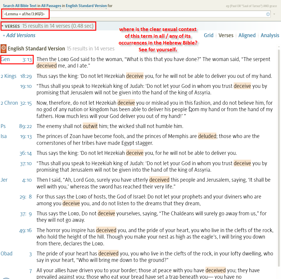 In regard to the second item, the graphic below. It is the search results for all forms of the lemma (root word) used in Gen 3:13. In no instance outside Gen 3:13 is there a sexual connotation to the deception — that therefore has to be invented and them superimposed on Gen 3:13.