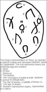 The article has a good deal else. I especially like the part where, after years spent becoming accepted by the Dogon, he began to carefully expose them to the ideas that Griaule had “learned” from Ogotemmelli, only to have his Dogon friends burst out laughing! One of the major services is van Beek’s lengthy descriptions (with illustrations) of how Griaule came to create the myths of the Dogon himself (which were uncritically absorbed by Temple and passed on to the populace in his book). Basically, there was a good amount of cultural mis-communication. Van Beek relates several anecdotes you can read for yourself, but his own epiphany in this regard is worth quoting here: