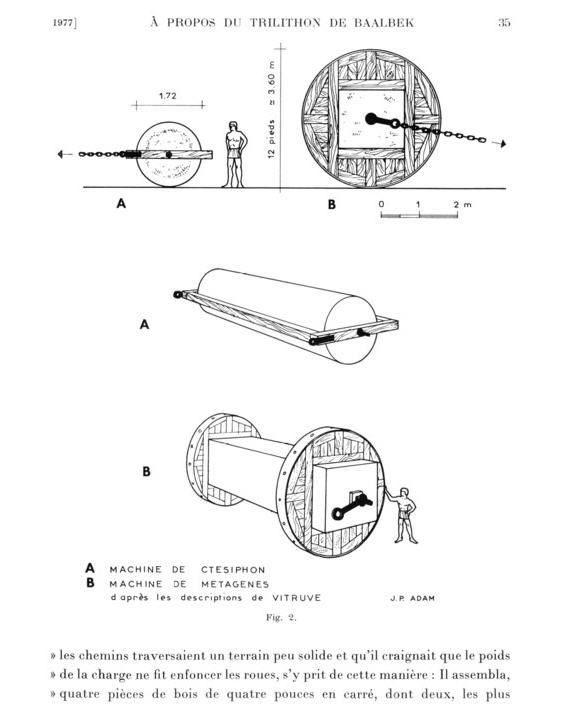The second transport means for the megaliths described by Vitruvius . . . consisted of wheels twelve feet (approx. 3.60 m) and “locked both ends of the architraves in the middle of the wheels. He put “as bolts and iron rings, so that when the horse” pulling the machine, put the bolts in the iron rings were “turning the wheels. Thus, the architraves, which were in the wheels “as axles, were dragged and taken on the spot.”