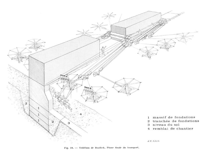 “To appreciate the magnitude of the work, and justify the solution adapted to it, it is necessary to give the figures for to the heavier blocks, namely those of trilithon As its name suggests this set consists of three stones measuring respectively, 19.60 m, 19.30 m and 19.10 m long, 4.34 m high, 3.65 m deep. Their average weight is nearly 800 tons. . . . every stone has nearly 10 m in length for an average weight of 350 tonnes . . . After recalling the experiences of St. Petersburg, Luxor, and Carrara, we can obtain a more lucidly clean solution for this megalithic structure and more particularly to the construction of the trilithon.”