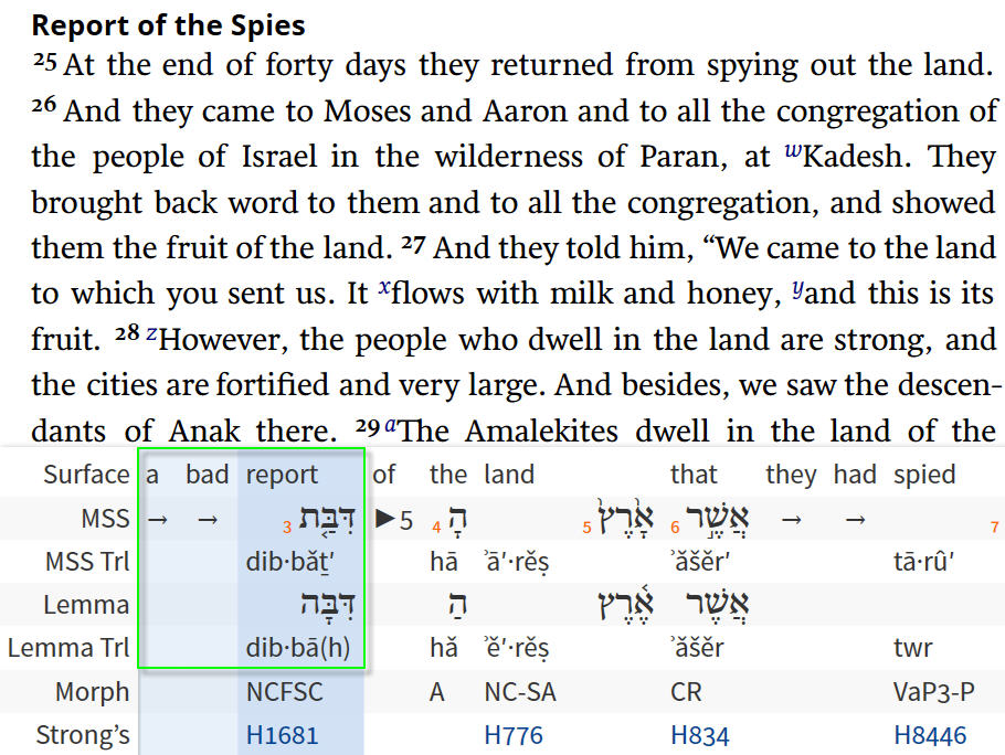 The assumption here is that the Hebrew word translated “bad” here means “false” – does it? Well, it would be nice (for starters) if the people making this argument actually looked up what’s behind the English translation. Here’s a screenshot of the passage using the Logos Reverse Interlinear pane: