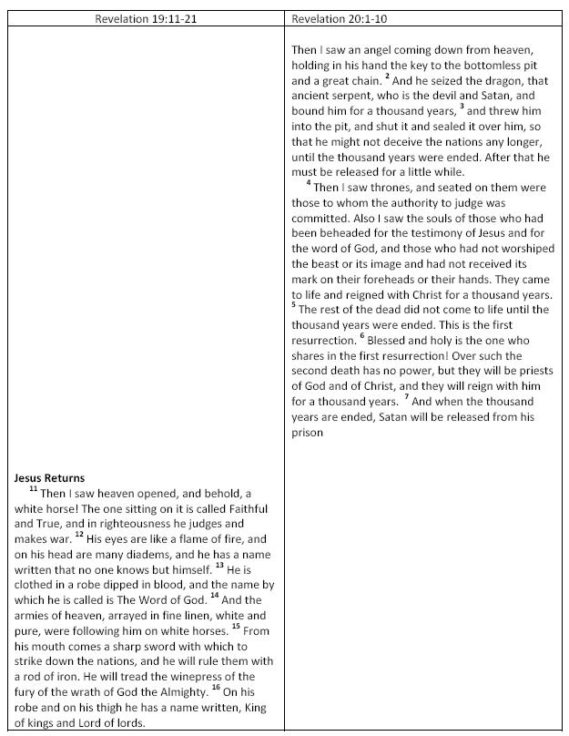 The reason the issue is important can be illustrated from one portion of the repeated cycling. Put simply, if Revelation 19:11-21 is reiterated in Rev 20:1-10, then there is no millennial kingdom. What follows will appear bewildering, but just observe the structuring and the gaps–then see my notes at the end. This will illustrate how an amillennialist uses the fairly obvious reiterative structure of Revelation 4-22 to argue against a literal 1000 year millennium. Stay with me.