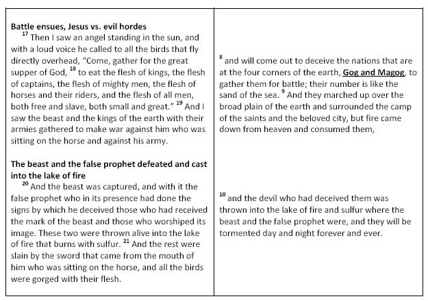 4. The fact that John explicitly references Gog and Magog in Rev 20:8 shows that JOHN intended Rev 20:8-10 to be a repetition of Rev 19:17-19.